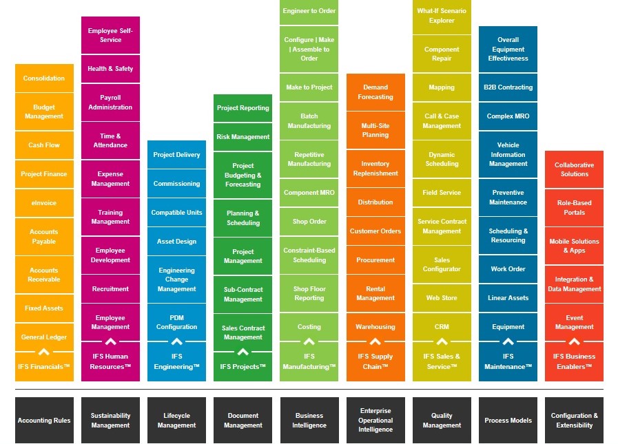 IFS Applications includes financials, human resources, quality management, document management, customer relationship management (CRM), business intelligence, sustainability management and other core functionality to facilitate full life cycle management of products, assets, customers, projects and more. Explore our product with this interactive graphic: